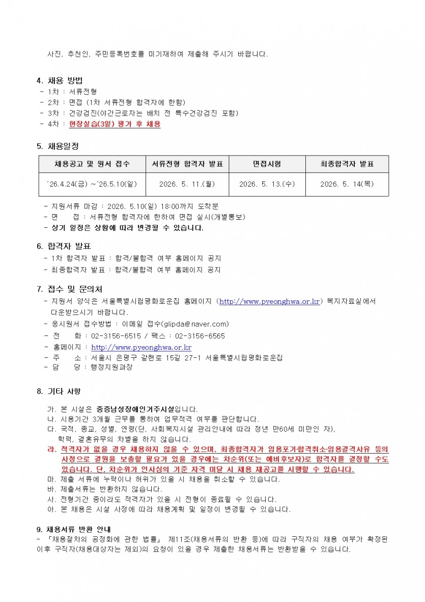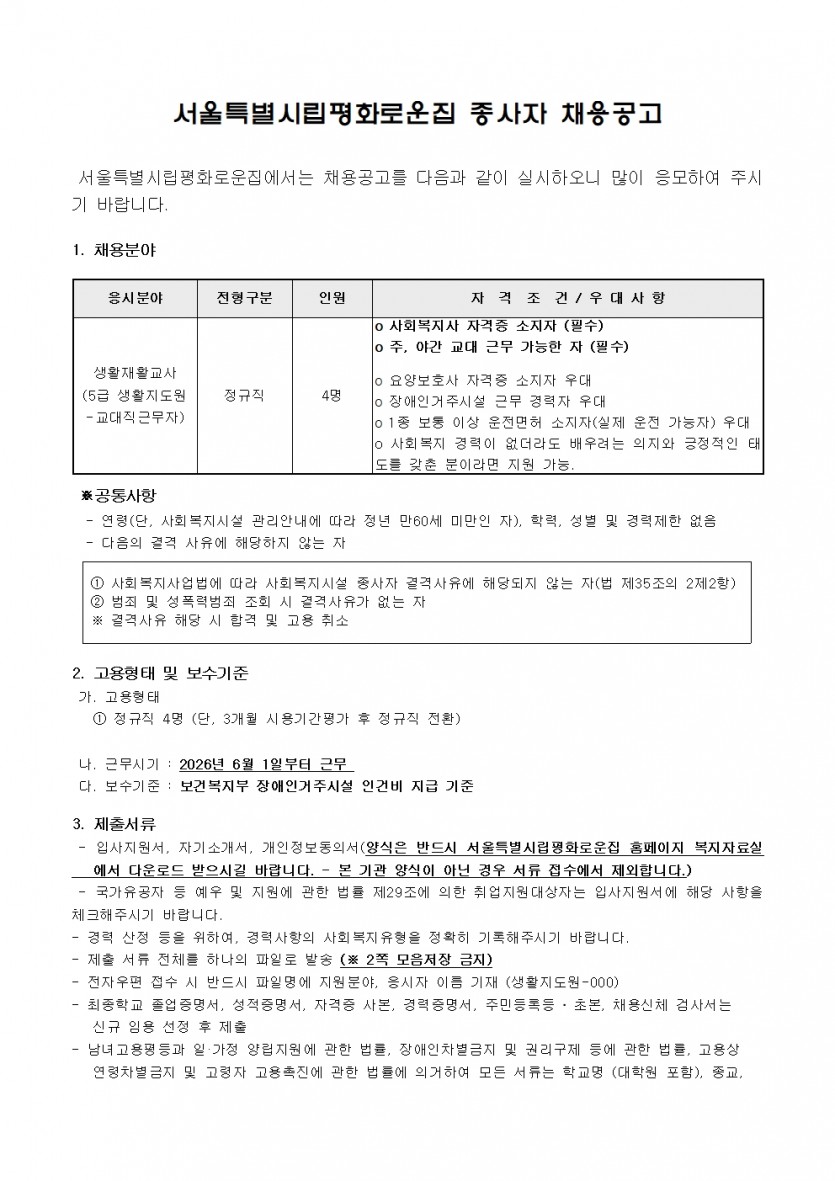 평화로운집 2차 직원(생활지도원) 채용 공고 페이지 정보 작성자 한동주 작성일 26-04-24 14:29 조회 69회 댓글 0건 첨부파일 파일 시립평화로운집 입사지원서이력서,자기소개서및개인정보동의서.hwp (54.0K) 1회 다운로드 DATE : 2026-04-24 14:29:20 본문 다음글 목록 답변
