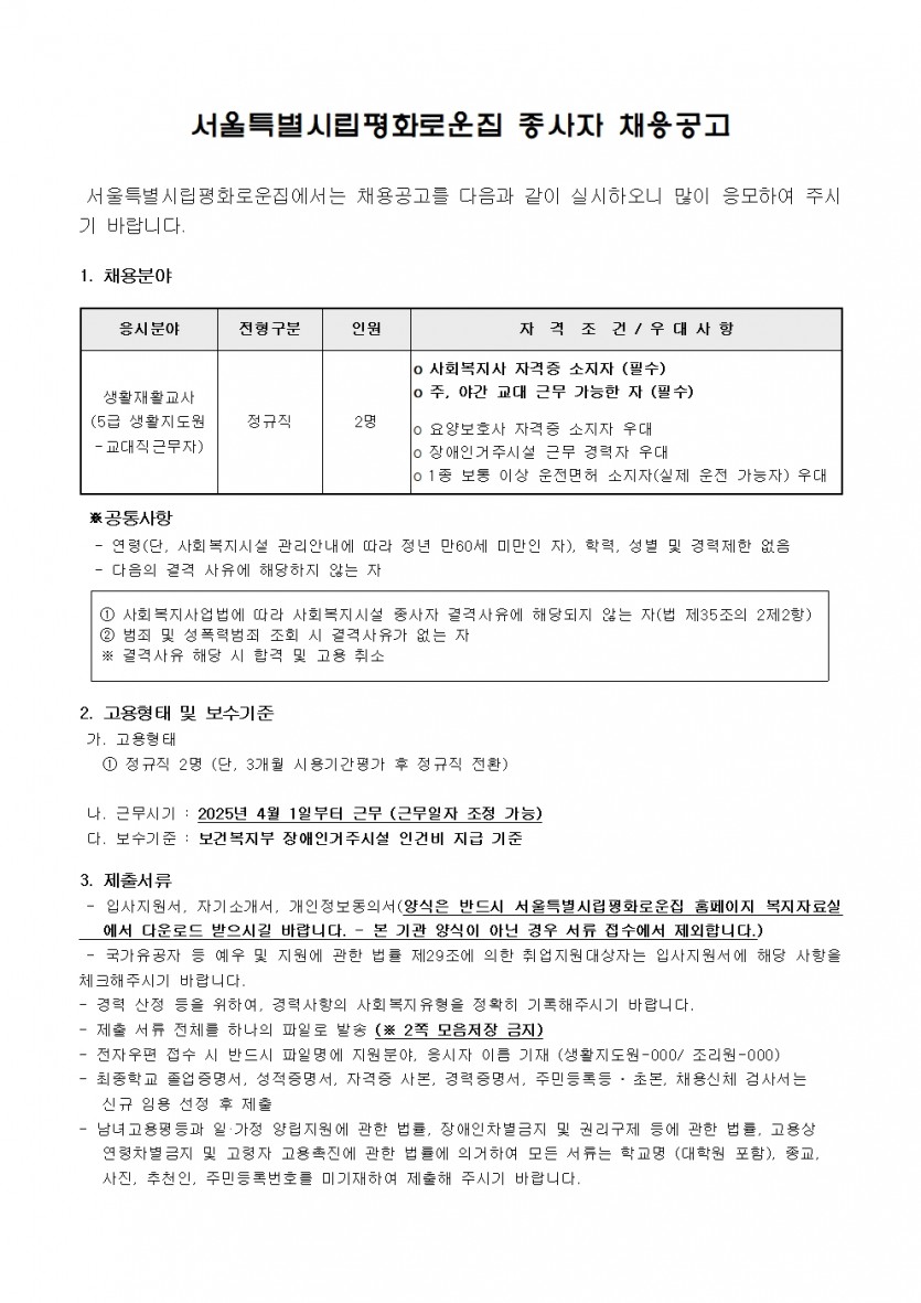 제2차 서울특별시립평화로운집 종사자 채용공고 페이지 정보 작성자 한동주 작성일 25-03-01 10:04 조회 13,483회 댓글 0건 첨부파일 파일 2025년-생활지도원 2차.hwp (58.5K) 154회 다운로드 DATE : 2025-03-01 10:07:51 파일 시립평화로운집 입사지원서이력서,자기소개서및개인정보동의서.hwp (54.0K) 188회 다운로드 DATE : 2025-03-01 10:07:51 본문 이전글 다음글 목록 답변