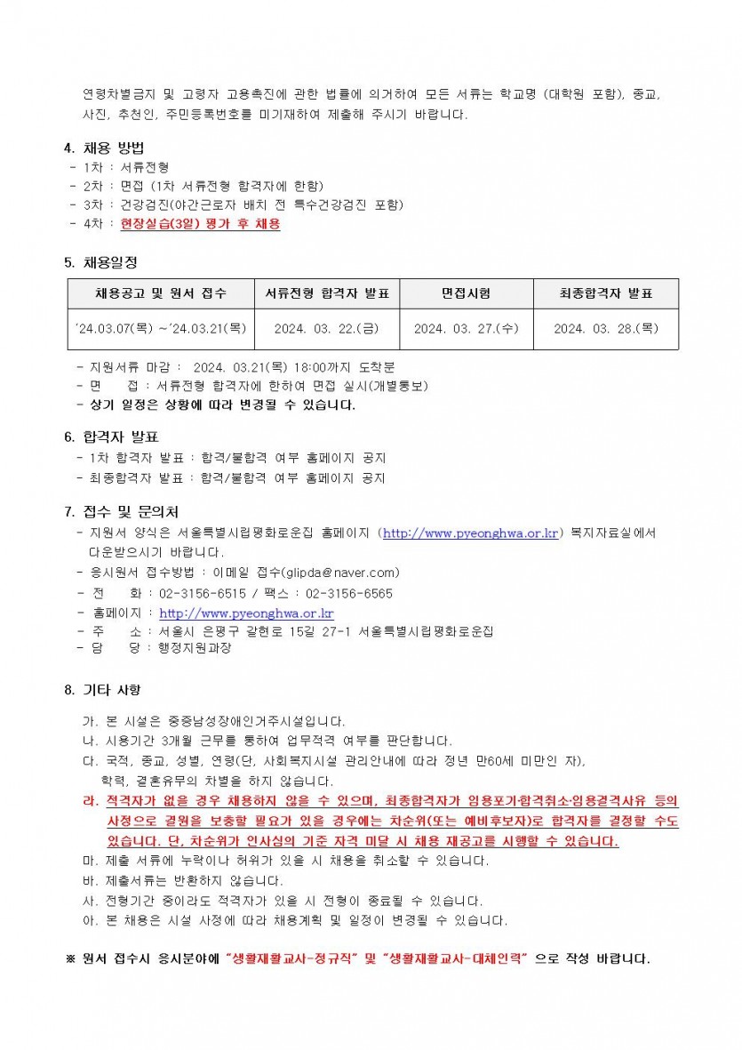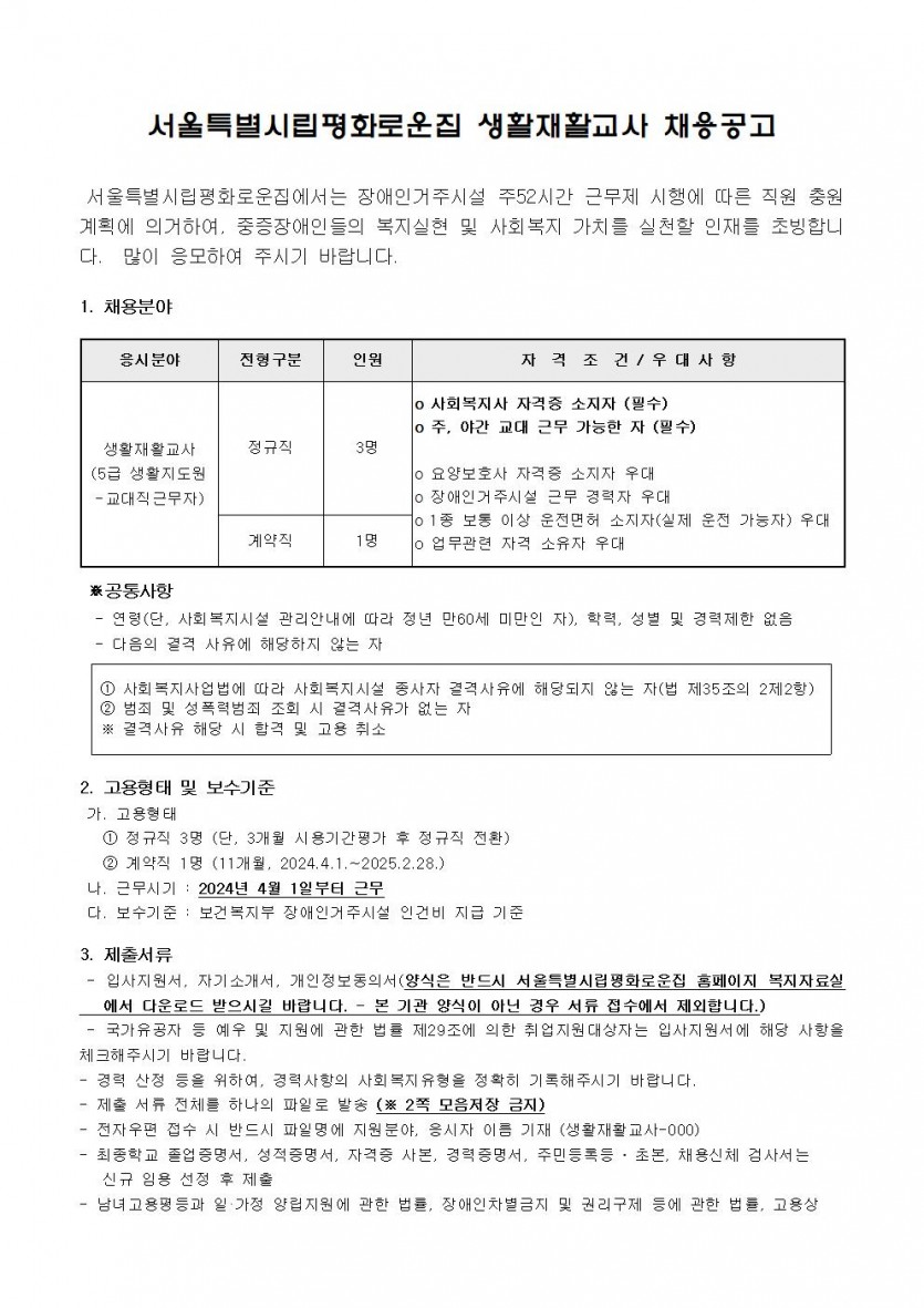 2024년 3차 직원채용(생활지도원) 모집공고 페이지 정보 작성자 한동주 작성일 24-03-07 17:21 조회 19,305회 댓글 0건 첨부파일 파일 시립평화로운집 입사지원서이력서,자기소개서및개인정보동의서.hwp (22.5K) 140회 다운로드 DATE : 2024-03-07 17:21:19 본문 장애인거주시설 주52시간 근무제 시행에 따라 정규직으로 근무할 생활재활교사(생활지도원) 채용 모집 공고를 실시하고자 합니다. 이전글 다음글 목록 답변