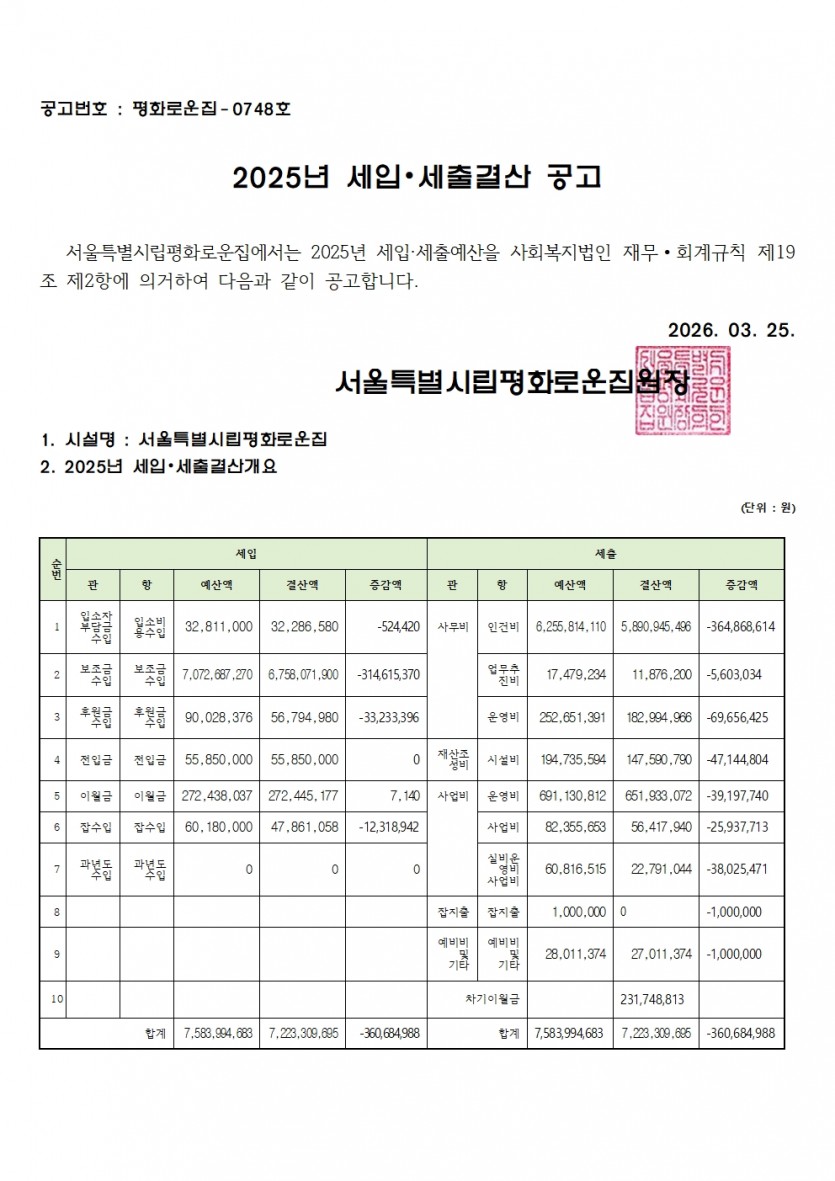 2025년 세입 세출 결산서 공고 페이지 정보 작성자 한동주 작성일 26-03-25 16:42 조회 95회 댓글 0건 첨부파일 파일 홈페이지 세입.세출견결산공고.pdf (58.6K) 4회 다운로드 DATE : 2026-03-25 16:42:12 본문 2025년 세입세출 결산서를 붙임과 같이 공고합니다. 이전글 다음글 목록 답변