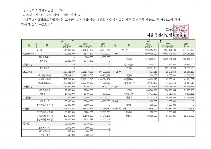 2026년 1차 추가경정 예산 공고 페이지 정보 작성자 한동주 작성일 26-03-25 16:51 조회 114회 댓글 0건 첨부파일 파일 홈페이지공고 .pdf (75.1K) 4회 다운로드 DATE : 2026-03-25 16:51:20 본문 이전글 다음글 목록 답변