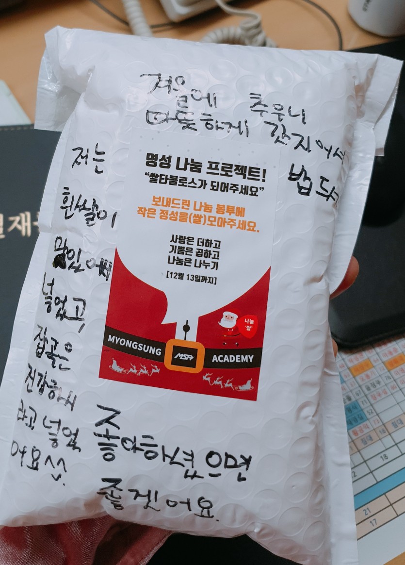 후원자·봉사자 이야기 | 명성체육관 후원물품 전달식 페이지 정보 작성자 박상은 작성일 19-12-30 17:27 조회 13,311회 댓글 0건 본문 매년 연말이면 우리 평화로운집에 따뜻한 나눔을 전하러 오시는 곳이 있습니다.바로 얼마 전 우수자원봉사단체상을 수상한 명성체육관 입니다!명성체육관에 다니는 아이들이 관장님의 마음을 따라나눔을 실천하고자 쌀을 모아주었습니다.아이들이 몇 달동안 함께 모아준 쌀 덕분에평화로운집 가족들은 올 겨울 내내 든든히 지낼 수 있을 것 같습니다^^천사같은 아이들의 손길로 모아진 값진 쌀!진심으로 고마움을 전합니다~♡ 이전글 다음글 목록