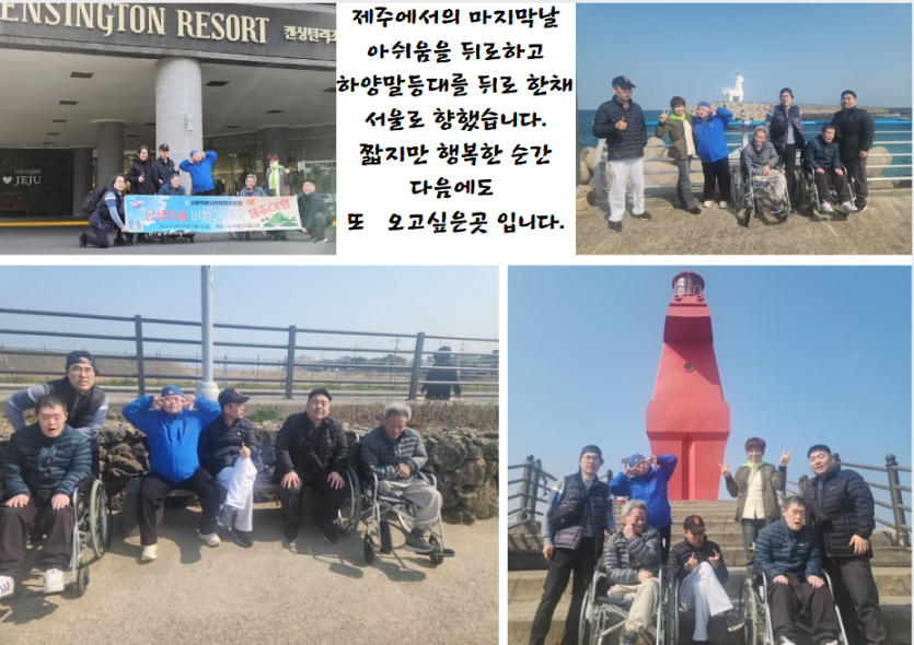 거주인 이야기 | "난생처음 비행기 타고" 제주 2차 여행 페이지 정보 작성자 장설궁 작성일 25-03-25 11:21 조회 5,663회 댓글 0건 본문 오늘은 선물입니다. 선물같았던 2박3일의 제주여행마음껏 즐기고... 감사하는 마음으로 보냈습니다. 특별한 날이 될 수 있도록 만들어 주심에 감사의 마음을 전합니다. 이전글 다음글 목록