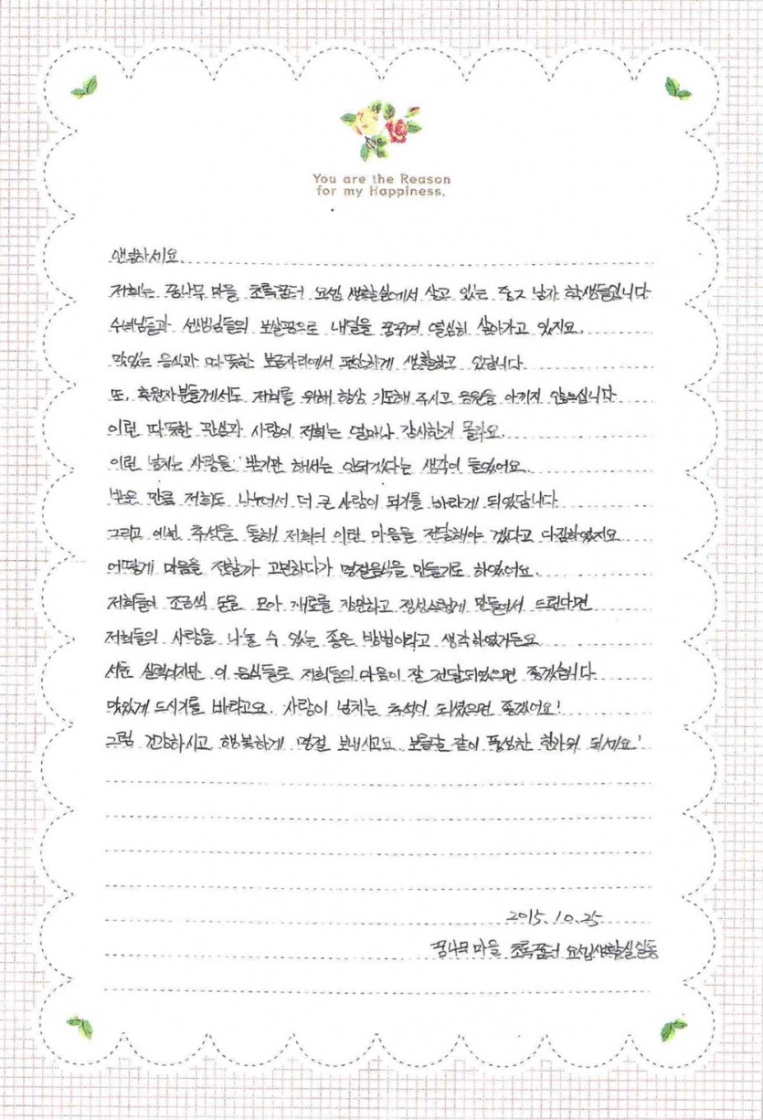 꿈나무마을에서 날아온 따뜻한 편지한장 페이지 정보 작성자 이상목 작성일 15-11-02 15:10 조회 9,485회 댓글 0건 첨부파일 본문 2015년 추석을 앞두고...저희 가족분들이 후원을 하는 꿈나무마을 학생들에게 한통의 감사편지가 들어왔습니다.아무리 장애를 가지고 있다해도 마음만큼은 늘 따뜻하고 정이 많으신 우리 가족 여러분들.고맙습니다~~우리 가족분들의 따뜻함을 여러분들과 함께 나누고 싶습니다. 이전글 다음글 목록