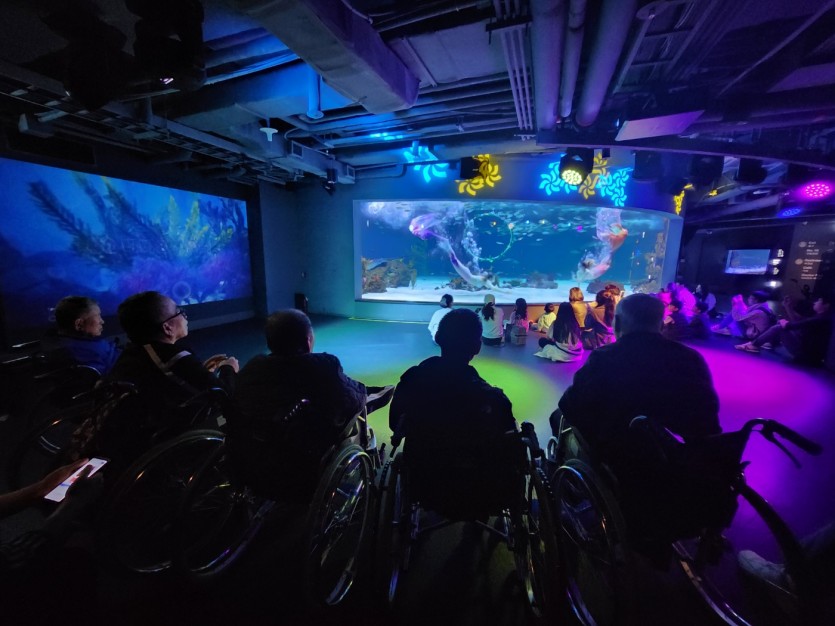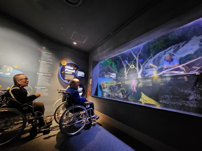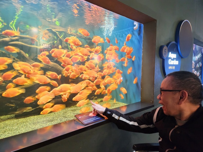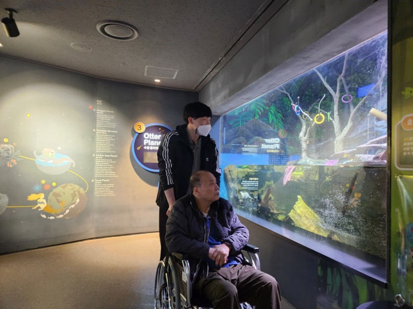아쿠아 플래닛 63에서 펭귄, 가오리, 수달 및 물개와 같은 생물의 생태설명회 관람