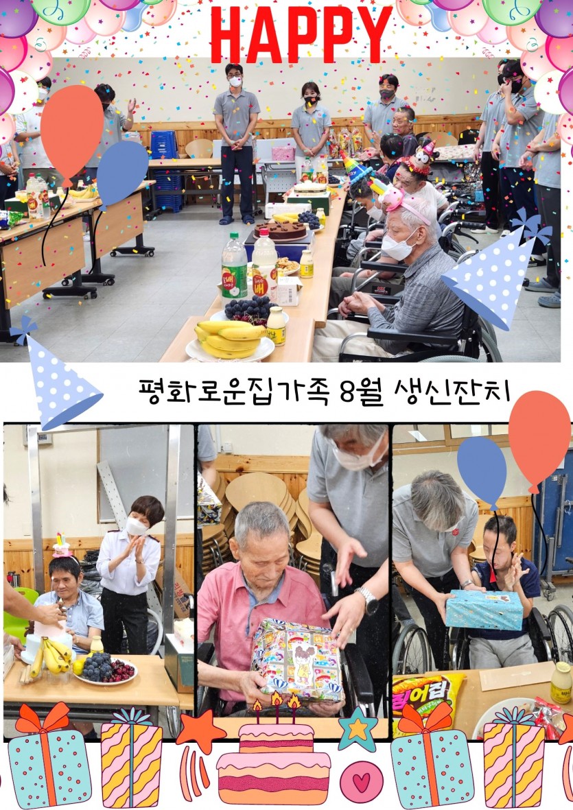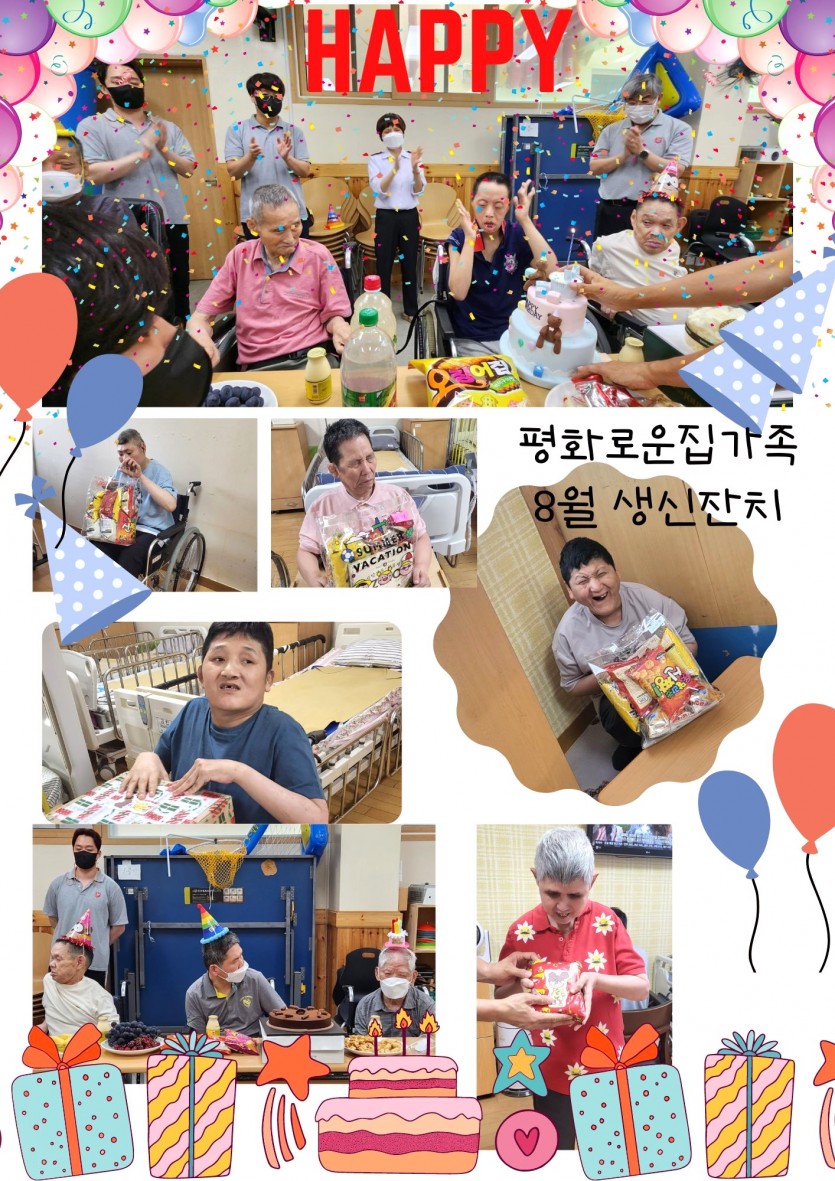 거주인 이야기 | 8월 생신잔치 페이지 정보 작성자 장설궁 작성일 23-08-08 15:39 조회 10,659회 댓글 0건 본문 평화로운집 가족의 8월 생일 잔치^^매년 돌아오는 날이지만항상 새로운 날이기도 하지요?연일 폭염이 지속되어 몸도 마음도 지치지만오늘만큼은 더 많이 웃고, 더 많이 행복하고, 더 많이 사랑받는 날되세요생일을 축하드리며 매일이 기쁨으로 가득 찬 행복한 날들이길 바랍니다. 이전글 다음글 목록