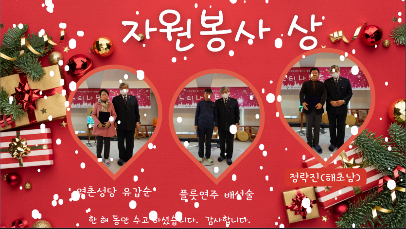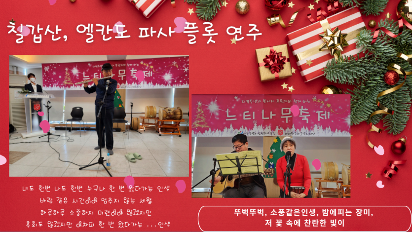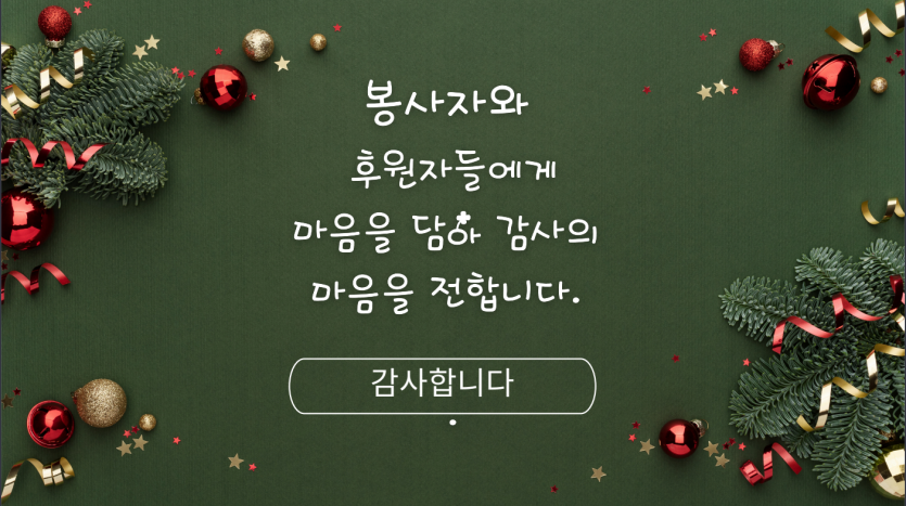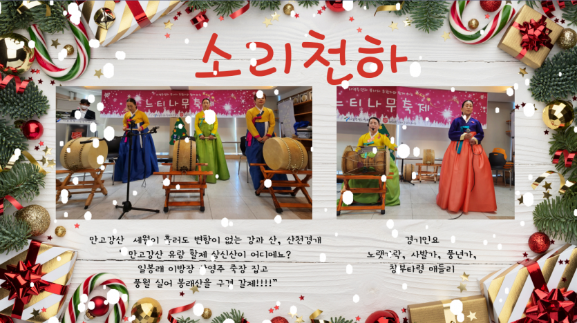 후원자·봉사자 이야기 | 1207 느티나무 축제 페이지 정보 작성자 장설궁 작성일 24-12-12 13:19 조회 6,583회 댓글 0건 본문 "2024년 12월 7일거주인, 자원봉사자, 후원자들과 함께 느티나무 축제를 진행하였습니다. 참석해주신 여러분들에게 감사의 마음을 전합니다. 여러분의 따뜻한 마음과 참여로 인해 행사는 더욱 특별하고 의미 있는 시간이 되었습니다. 여러분의 지지와 도움에 진심으로 감사드립니다. 다시 한 번 참석해주신 여러분들에게 진심으로 감사의 말씀을 전하며, 앞으로도 함께 더 많은 아름다운 순간을 만들어 나가기를 기대합니다. 감사합니다." 이전글 다음글 검색 목록