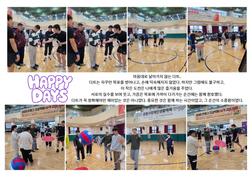 거주인 이야기 | 은평구 생활체육 한마음 페이지 정보 작성자 장설궁 작성일 25-10-27 10:12 조회 2,105회 댓글 0건 본문 은평구 생활체육 한마당에 다녀왔습니다. 여러 친구들과 함께한 시간은 즐거웠습니다.서로의 실력을 겨루기도 하고 응원하며 웃어보기도 하고이런 행사는 지역 사회의 유대감과 건강한 생활을 장려하는 데큰 도움이 되는 것 같습니다. 다음엔 꼭 이길게..라는 한 마디에 내년을 기약해 봅니다. 이전글 다음글 목록