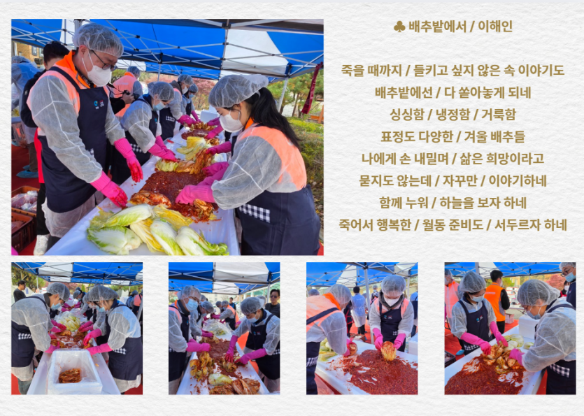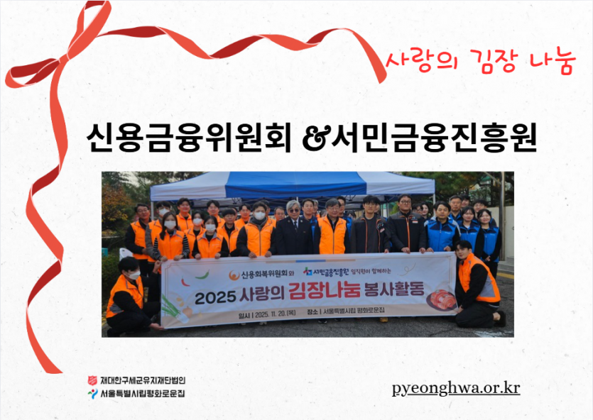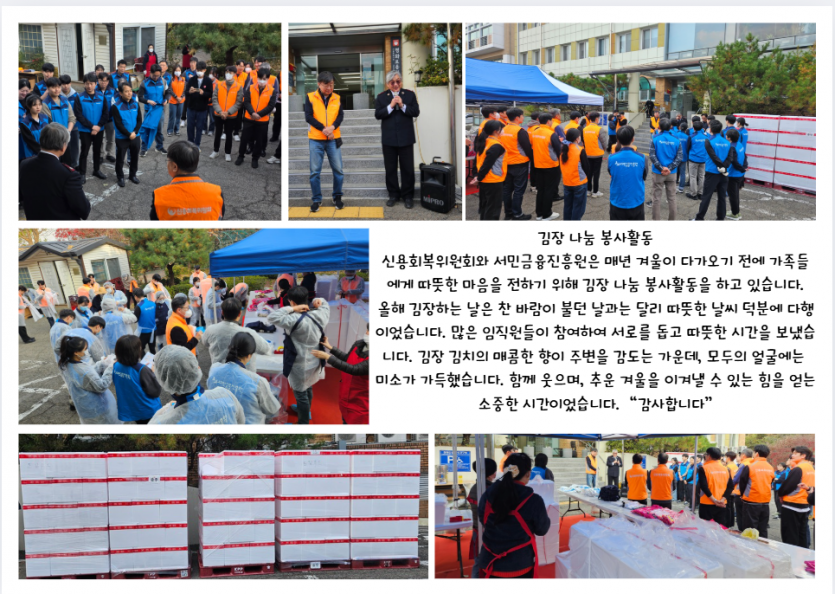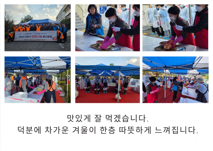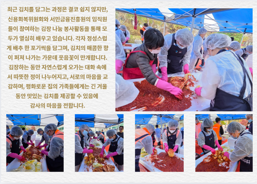 후원자·봉사자 이야기 | 신용회복위원회와 서민금융진흥원과 함께 하는 김장 페이지 정보 작성자 장설궁 작성일 25-11-26 11:16 조회 1,700회 댓글 0건 본문 신용회복위원회와 서민금융진흥원과 함께한 김장임직원분들께서 직접 김치를 담으며 가족분들이 겨울에 맛있게 드신다는 생각에 한 포기 한 포기 정성을 담아따뜻한 마음을 전해주셨습니다. 이 김치가 식탁에 오를 때마다 사랑이 깃든 이 따스함을잊지 않겠습니다. 함께해 주신 모든 분들께 다시 한 번 깊은 감사를 드립니다.고맙습니다.감사합니다. 이전글 다음글 목록