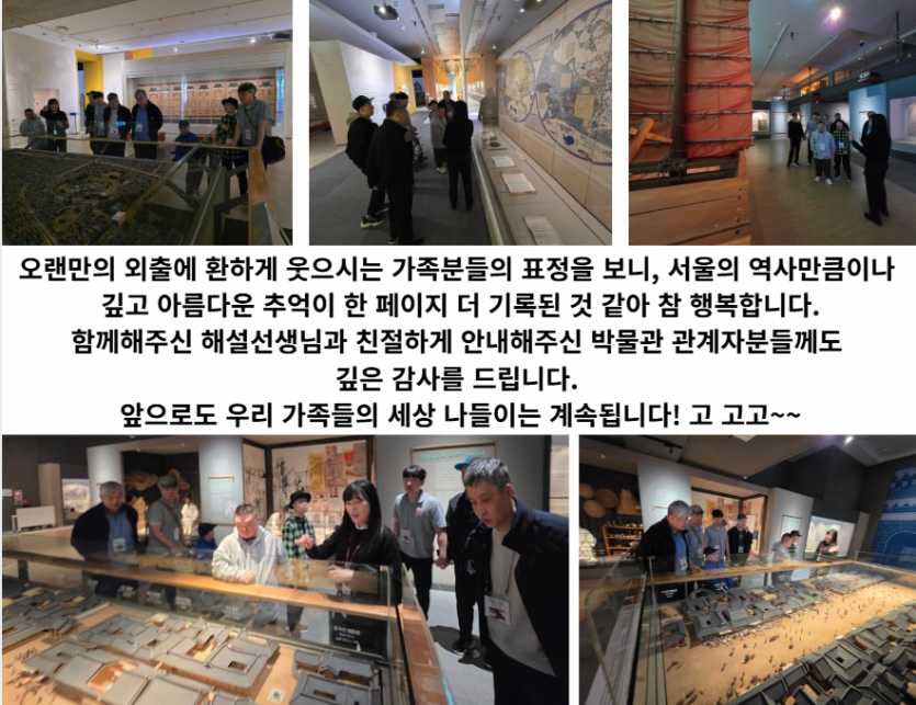 거주인 이야기 | 서울역사박물관 견학 페이지 정보 작성자 장설궁 작성일 26-04-03 17:37 조회 55회 댓글 0건 본문 살랑살랑 불어오는 봄바람을 타고, 우리 평화로운집 가족들은 서울의 역사가 살아 숨 쉬는 '서울역사박물관'으로 나들이를 다녀왔습니다.박물관 곳곳을 둘러보며 옛 서울의 풍경에 발길을 멈추기도 하고, "예전엔 이랬지~" 하며 정겨운 옛 기억을 소환해보기도 하는 뜻깊은 시간이었습니다. 세심하게 준비된 전시물들 덕분에 가족분들도 모두 편안하고 즐겁게 관람을 마칠 수 있었습니다. 다음글 목록