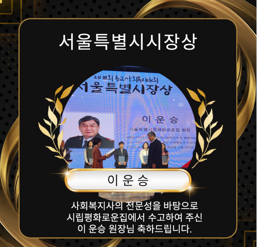 제18회 종교사회복지대회 서울특별시장상 페이지 정보 작성자 장설궁 작성일 24-01-10 11:51 조회 6,166회 댓글 0건 본문 지난 12월 27일 오후 4시 30분 서울 마포구 케이터틀에서 ‘제18회 종교사회복지대회’를 개최했습니다사회복지의 성장을 위해 헌신한 서울특별시립평화로운집 이운승 원장님께서 서울특별시시장상 수상하셨습니다. 축하드립니다. 이전글 다음글 목록