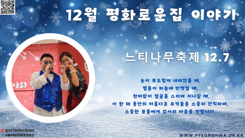 2024년 12월 후원감사편지 페이지 정보 작성자 장설궁 작성일 24-12-01 11:04 조회 5,738회 댓글 0건 본문 얼마전 첫눈이 내렸는데...그것도 엄청 많이..혹시 보셨나요?날씨도 갑자기 추워지고, 눈도 내리는 것이 본격적인 겨울이 왔나 봅니다.한 해가 가버린다고 아쉬워하기 보다는 아직 남아있는 시간들을 알차게 보내는 12월 되시길 바랍니다. 항상 건강하시고 행복하세요 이전글 다음글 목록