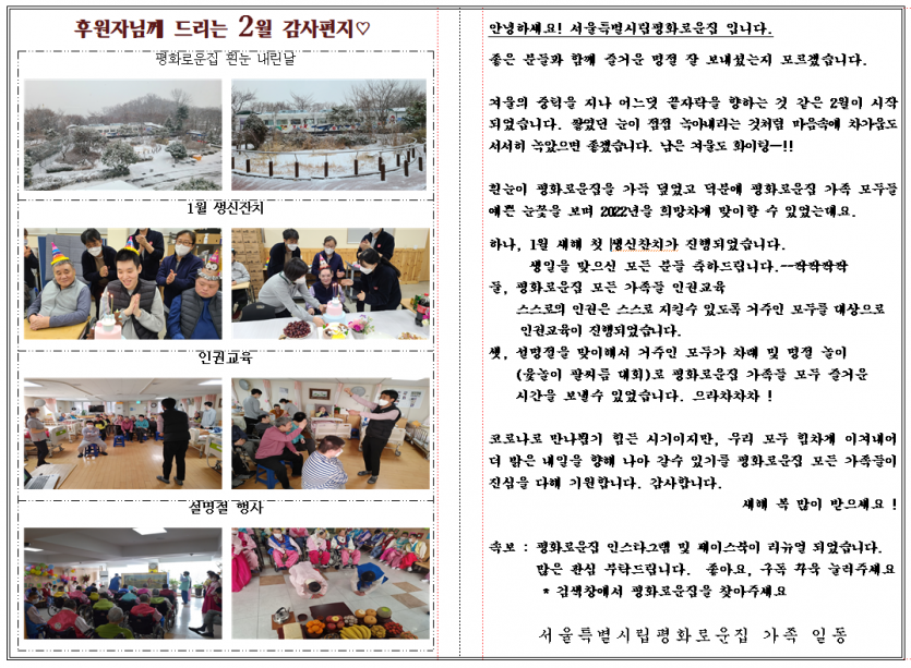 2022년 2월 후원자 감사편지 페이지 정보 작성자 김동현 작성일 22-02-07 14:21 조회 12,952회 댓글 0건 본문 2022년 2월, 겨울이 지나가고 봄이 오고 있습니다.항상 평화로운 집과 함께해주시는 후원자님들께감사의 편지를 올립니다. 이전글 다음글 목록