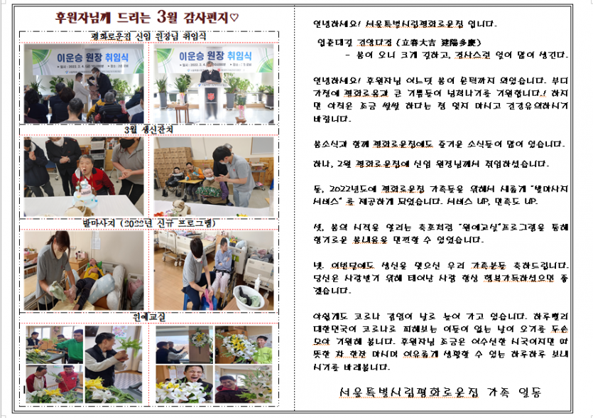 2022년 3월 후원자 감사편지 페이지 정보 작성자 장설궁 작성일 22-07-08 13:10 조회 12,029회 댓글 0건 본문 ♧ 그 어느 해보다 바쁘고 힘겨웠던 겨울을 보낸 뒤 그 어느 해처럼 반갑게만 느껴왔던 봄을 맞이하였습니다. 포근한 햇살에 포근한 봄바람을 실어 평화로운집 식구들의 소식을 전해드립니다~~~ ♧ 이전글 다음글 목록