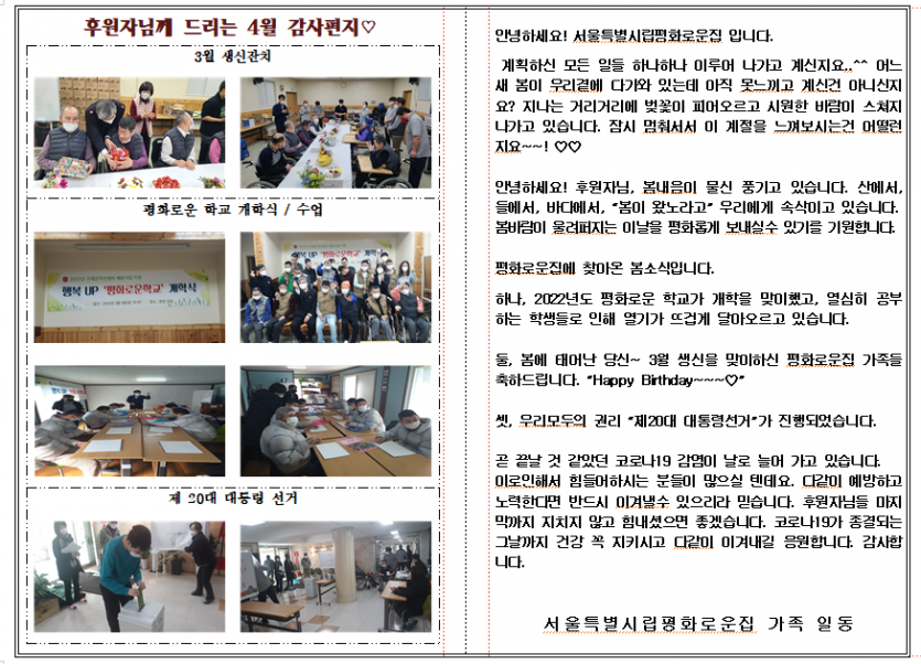 2022년 4월 후원자 감사편지 페이지 정보 작성자 장설궁 작성일 22-07-08 13:20 조회 12,018회 댓글 0건 본문 ♡ 봄향기가 느껴지는 4월 입니다. 행복의 향기가 가득하기를 기원하면서 저희 평화로운집 식구들의 이야기를 전해 드립니다~~♡ 이전글 다음글 목록