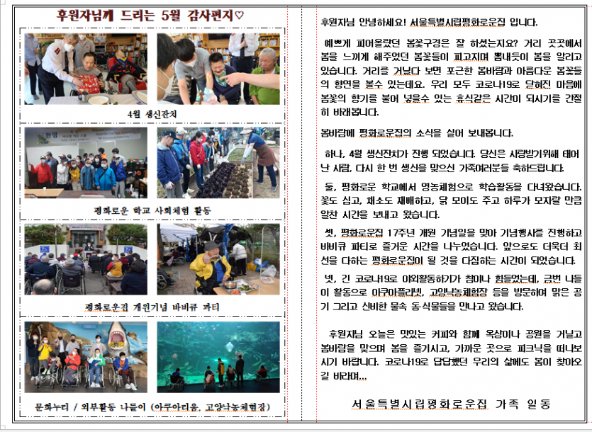 2022년 5월 후원자 감사편지 페이지 정보 작성자 장설궁 작성일 22-07-08 13:31 조회 12,078회 댓글 0건 본문 ♤ 봄향기가 향기로운 5월 이예요~~5월엔 5배로즐겁고 행복한 일들만 가득 하시길 바라며 저희 평화로운집 식구들의 소식을 전합니다.♤ 이전글 다음글 목록