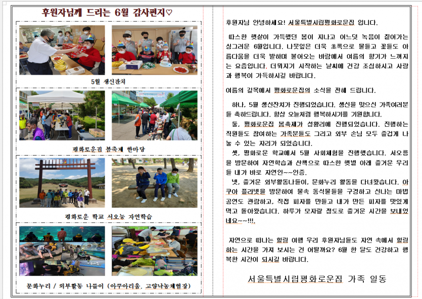 2022년6월 후원자 감사편지 페이지 정보 작성자 장설궁 작성일 22-07-13 18:03 조회 12,076회 댓글 0건 본문 "어느덧 한 해의 반인 6월이 다가왔습니다"특히, 6월은 호국보훈의 달이기도 하지요. 6월어느 하루 쯤은 오늘의 나라를 위해 희생한 많은 사람들을 위한 생각을 해보았으면 합니다. 덥고 습해지는 날씨에 건강에 유의하시고 항상 행복하시기 바라면서 평화로운집 가족들의 소식을 전해드립니다~~~ 충성 !! 이전글 다음글 목록