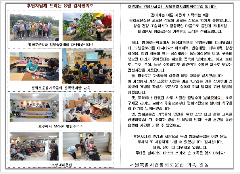 2022년 8월 후원자 감사편지 페이지 정보 작성자 장설궁 작성일 22-08-08 10:43 조회 11,897회 댓글 0건 본문 8월은 내가 나에게 휴식을 선물하는 의미 있는 달이였으면 좋겠습니다.새해를 열면서 다짐했던 것을 실천하고 있는 나에게 선물을 주는 8월!그 선물 속에는 가족과 친구가 있고 함께 지낸 사람들의 고마움도 담겨 있겠지요.시간은 빠르게 지나갑니다. 누구나 그러하듯이 또 다른 한 해를 향한 남은 시간도 더 빠르게 지나가겠지요 (●'◡'●)8월에 받은 선물이 가을과 겨울로 이어져서 행복이 될 수 있게 꿈이 담겼으면 좋겠습니다. 이전글 다음글 목록
