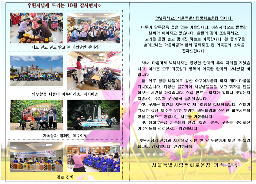 2022년 10월 후원감사편지 페이지 정보 작성자 장설궁 작성일 22-10-02 14:02 조회 11,353회 댓글 0건 본문 후원자님 안녕하세요 잘지내셨나요?아침저녁 공기가 제법 차가워진 10월입니다높고 푸른 가을 하늘과 시원한 가을바람에 기분 좋은 가을의 문턱!맑고 높은 가을 하늘처럼 늘 후원자님에게 좋은 일만 가득하길 바라며 10월 평화로운집 가족들의 이야기를 전합니다. 이전글 다음글 목록