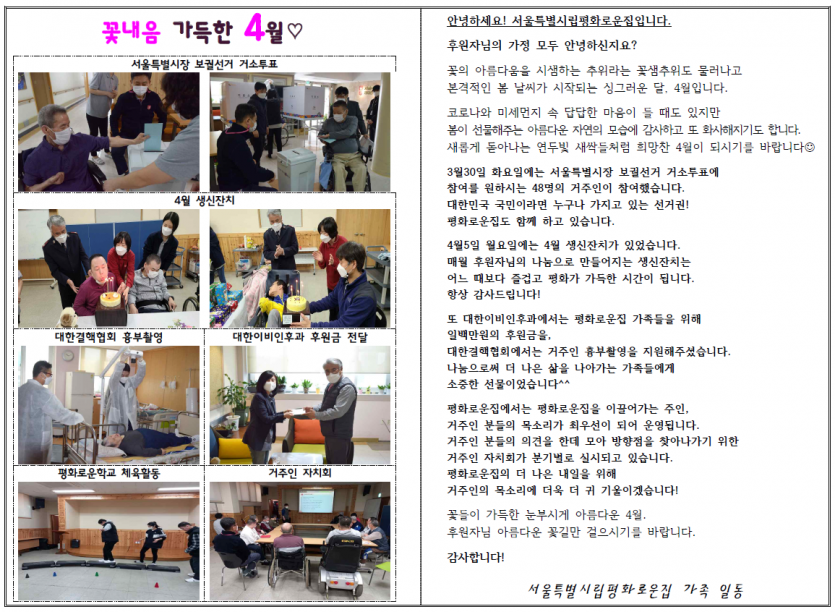 2021년 4월 후원자 감사편지 페이지 정보 작성자 박상은 작성일 21-04-07 09:40 조회 14,320회 댓글 0건 본문 2021년 4월, 활짝 핀 꽃들의 아름다움처럼 빛나는 후원자님의 나눔에 감사드립니다.늘 나눔으로 함께해주시는 후원자님께감사의 편지를 올립니다. 이전글 다음글 목록