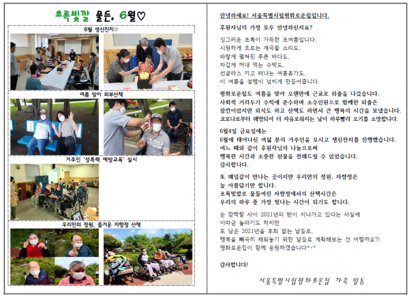2021년 6월 후원자 감사편지 페이지 정보 작성자 박상은 작성일 21-06-25 16:47 조회 14,000회 댓글 0건 본문 초록빛깔 물든 6월항상 사랑으로 함께 해주시는 후원자님의 나눔에 감사드리며,감사의 편지를 올립니다. 이전글 다음글 목록