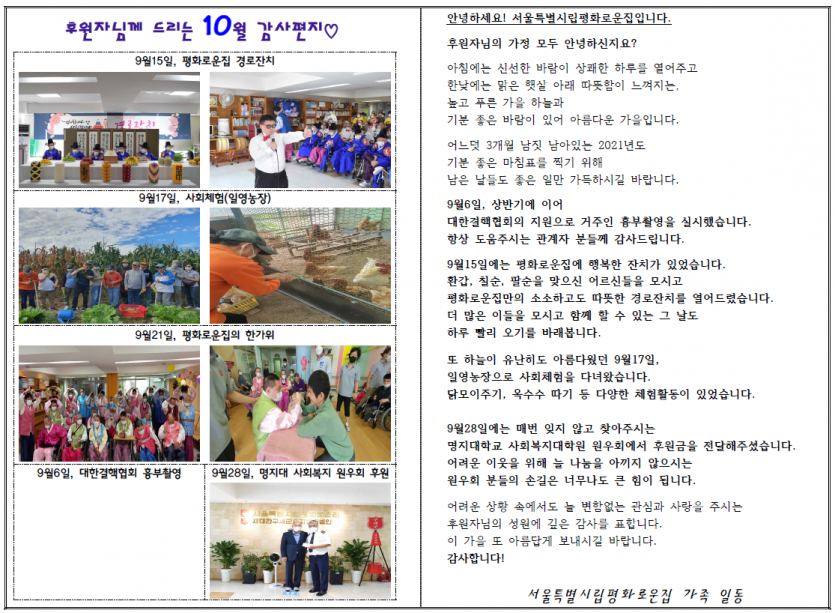 2021년 10월 후원자 감사편지 페이지 정보 작성자 박상은 작성일 21-11-18 10:04 조회 12,641회 댓글 0건 본문 청량한 하늘이 아름다운 10월,후원자님께 감사의 편지를 올립니다. 이전글 다음글 목록