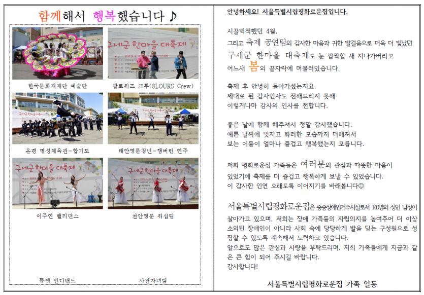 2019년 4월 연합축제 공연팀 감사편지 페이지 정보 작성자 박상은 작성일 20-09-11 11:50 조회 13,583회 댓글 0건 본문 첫 실시된 3개시설 연합축제에 귀한 발걸음 해주시고멋진 공연을 선물해주신 관계자 분들께감사의 편지를 올립니다. 이전글 다음글 목록