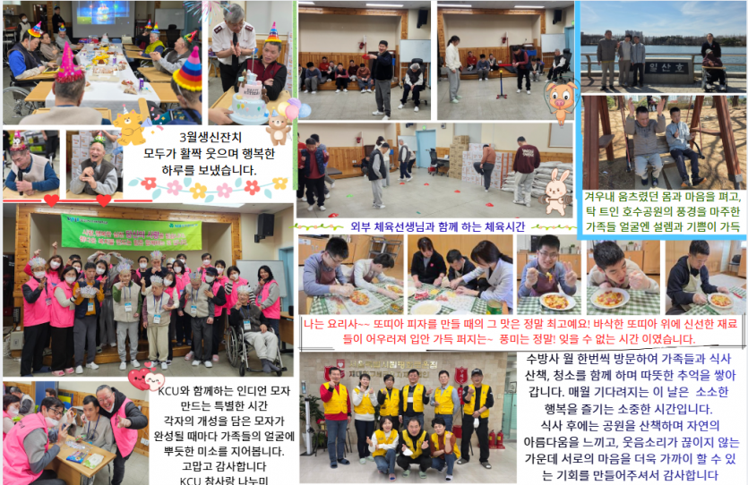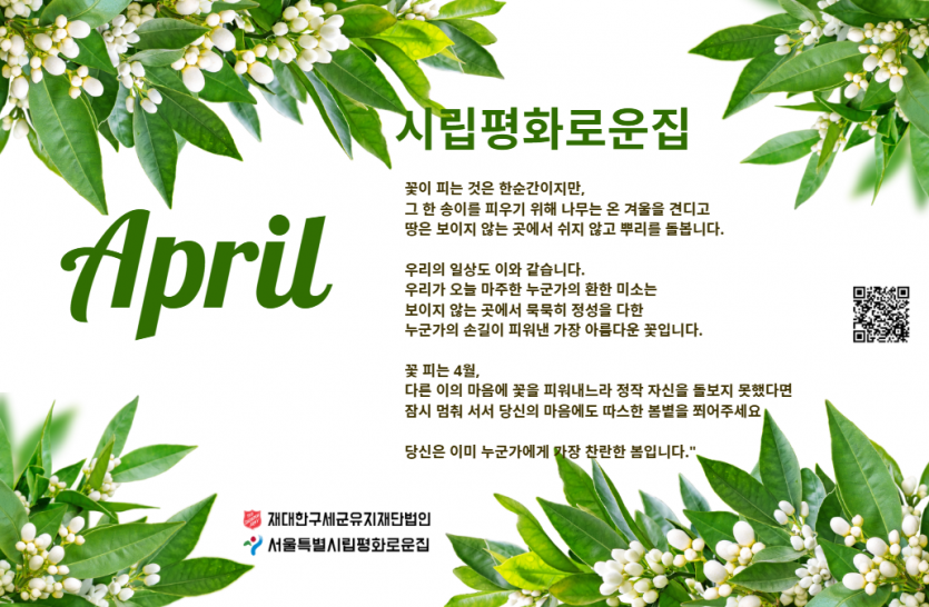 2026년 시립평화로운집 4월 후원감사편지 페이지 정보 작성자 장설궁 작성일 26-04-01 16:51 조회 35회 댓글 0건 본문 꽃보다 아름다운 마음을 나누어 주시는 후원자님께 감사드립니다. 후원자님의 나눔은 우리 거주인 분들에게 따뜻한 밥 한 끼가 되고, 깨끗한 보금자리가 되며, 내일을 살아갈 희망이 됩니다.보내주신 사랑에 보답하기 위해 오늘도 저희는 정성을 다해 거주인 분들을 모시겠습니다. 기분 좋은 봄바람처럼 늘 행복한 일들만 가득하세요! 다음글 목록