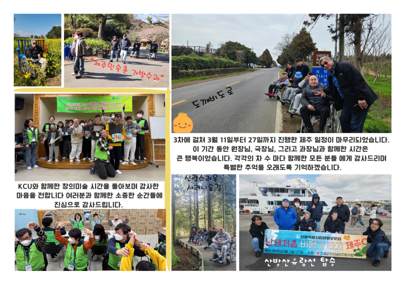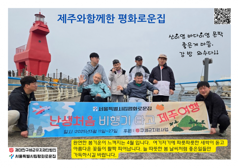 2025년 시립평화로운집 4월 후원 감사 편지 페이지 정보 작성자 장설궁 작성일 25-04-01 11:43 조회 4,434회 댓글 0건 본문 따뜻한 봄의 기운이 가득한 4월, 여러분의 사랑과 후원에 진심으로 감사드립니다.3월에 제주도에서 새로운 경험을 하였습니다. 다양한 문화와 아름다운 자연환경을 경험하며 새로운 영감을 얻는 시간이었습니다. 여러분의 관심과 사랑으로, 우리는 더 큰 꿈을 향해 나아갈 수 있습니다. 여러분의 지속적인 사랑과 후원에 감사드리며, 우리가 함께하는 이 여정에서 더 큰 성과를 이루기를 기대합니다.진심으로 감사드립니다. 이전글 다음글 목록